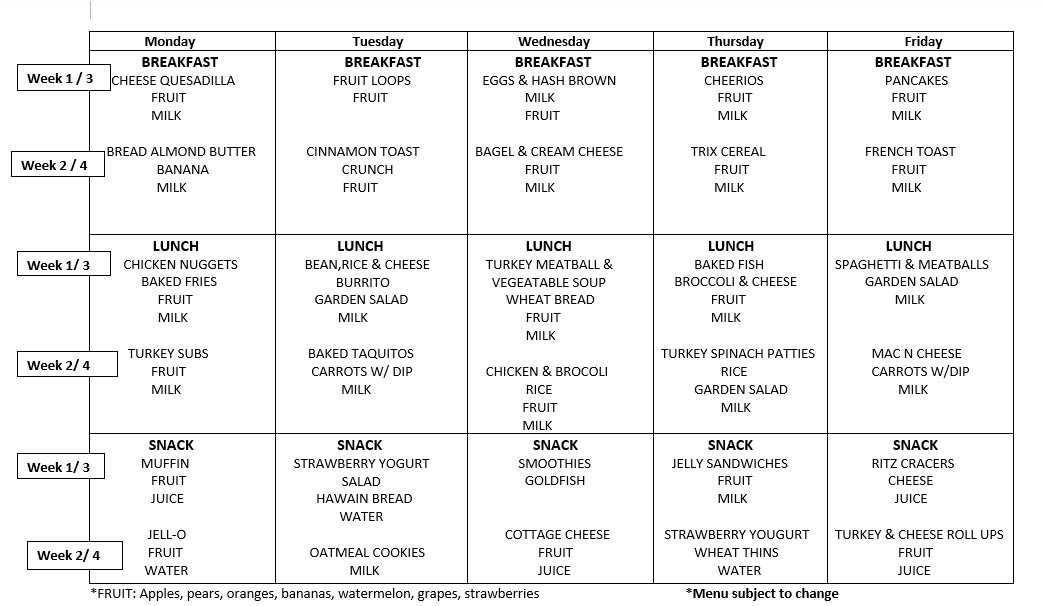 Dreamland Learning Centers Weekly Menu